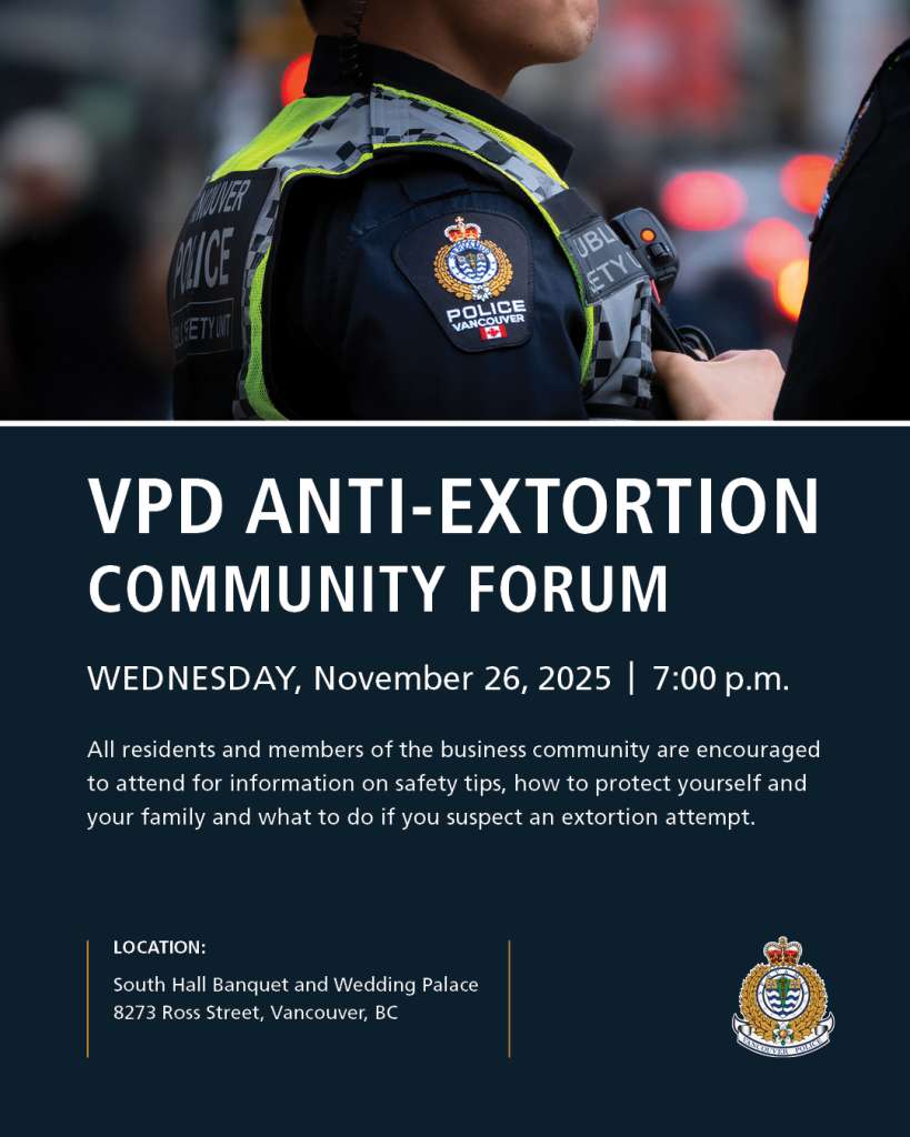 All residents and members of the business community are encouraged to attend a VPD Anti-Extortion Community Forum on Wednesday, November 26, 2025 at 7:00 p.m. at the South Hall Banquet and Wedding Palace, 8273 Ross Street, Vancouver. We’ll share information on safety tips, how to protect yourself and your family, and what to do if you suspect an extortion attempt.