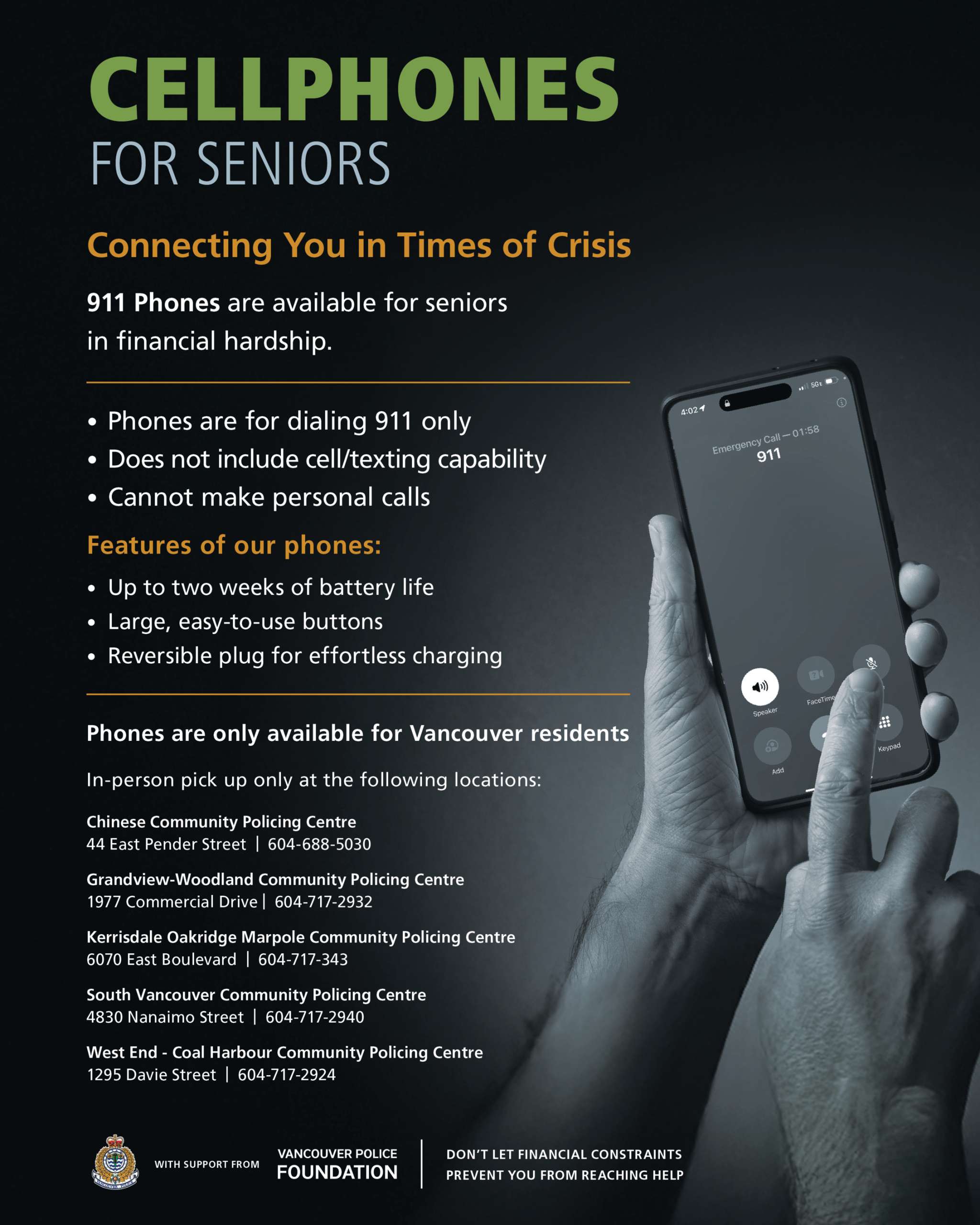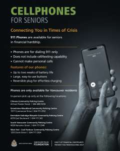Thanks to the Vancouver Police Foundation, the VPD can offer free cellphones to seniors in need to enhance their safety and well-being. The phones are designed to make outgoing calls to 911 only and cannot receive incoming calls or texts. They are easy to operate, and there is no monthly plan or cost.