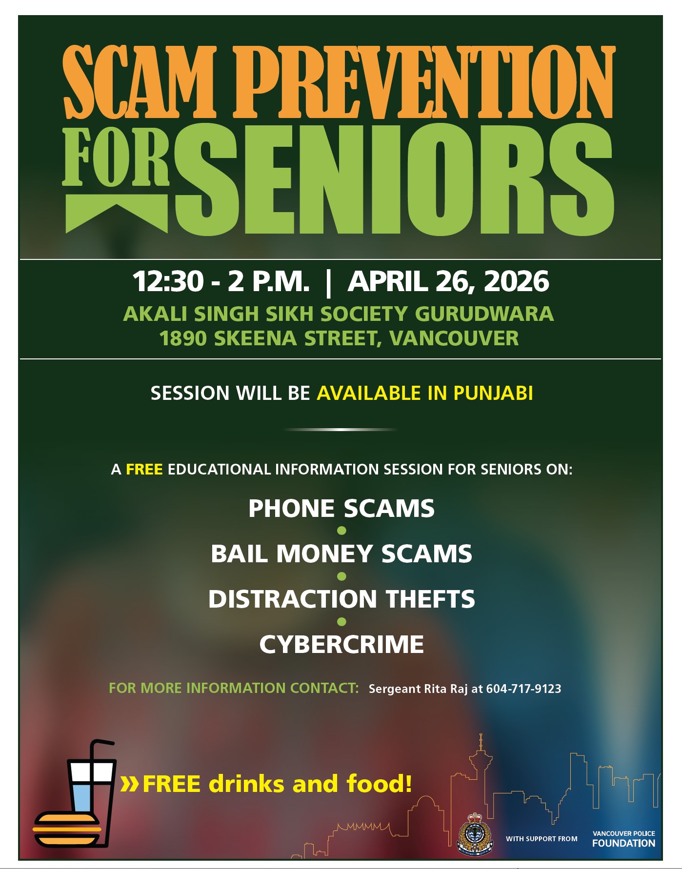 If you’re interested in having the VPD Scam Prevention team present to a group of 50 or more, please email any of the following organizers to get more information or request a session. The topics include: bail scams, financial crimes, distraction thefts, and cybercrime.