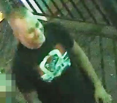 The suspect is Caucasian, about six feet tall, with an athletic build and short, dark hair. He was wearing black shorts and a black t-shirt with a red, white, and blue design on the front.