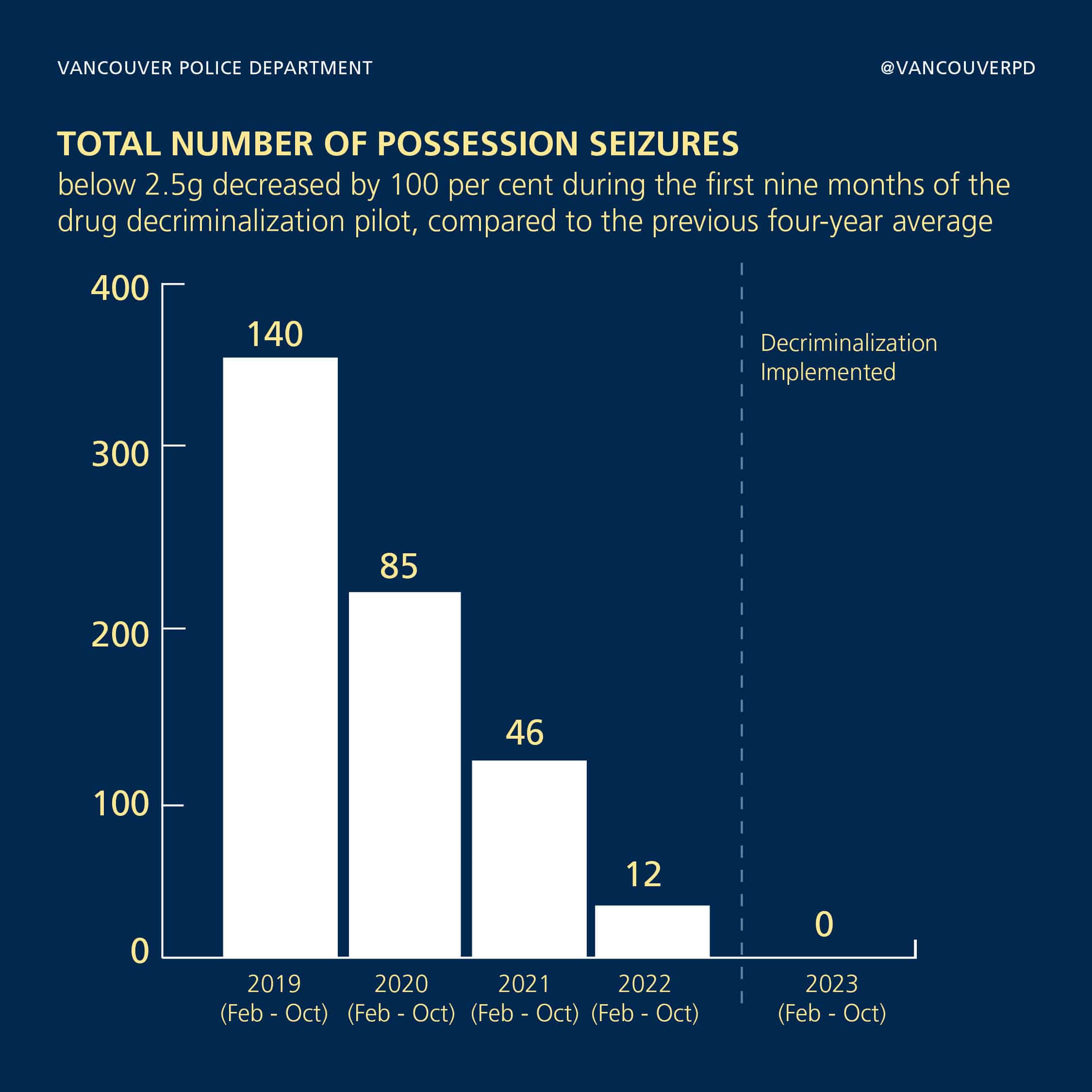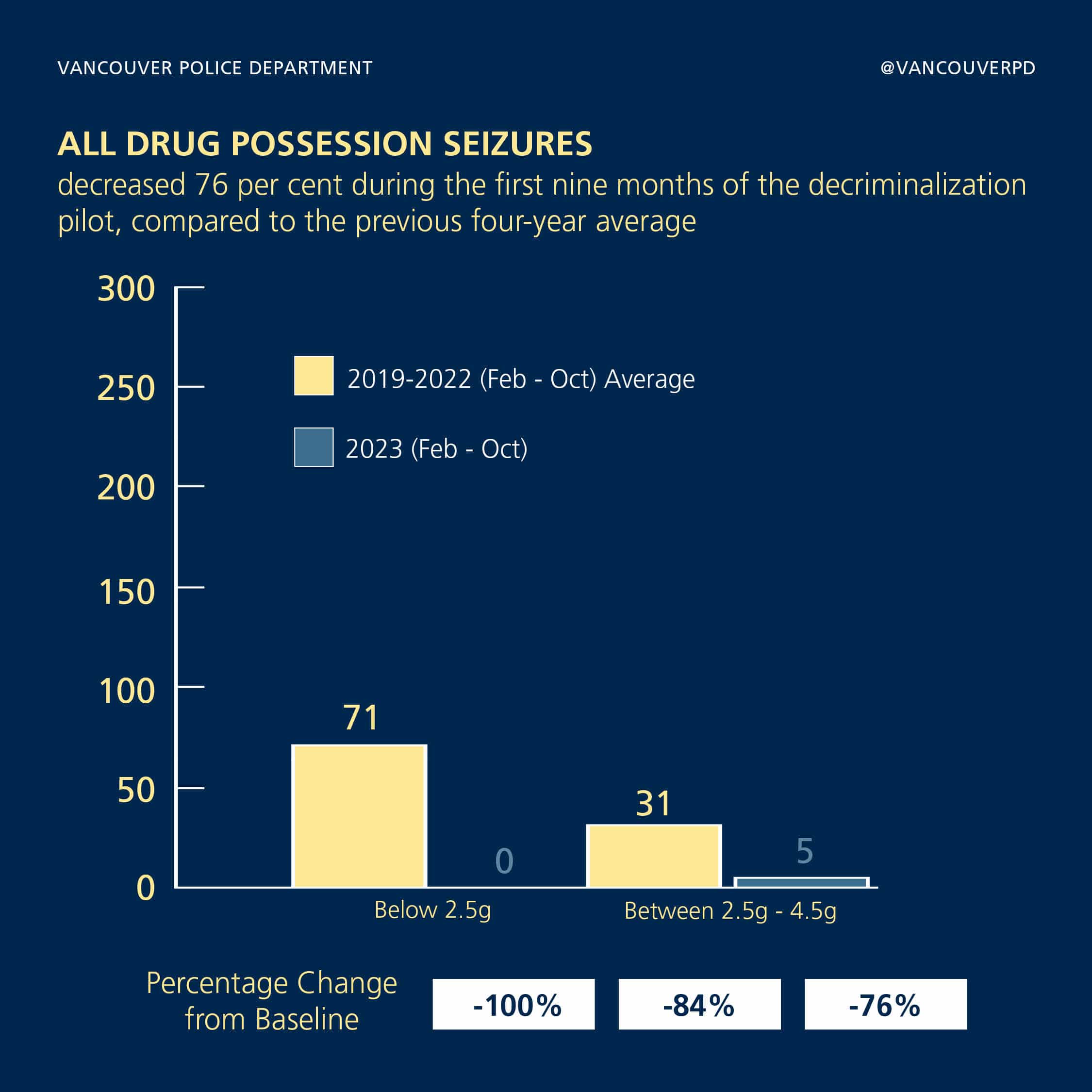 During the first nine months of the program, VPD made no possession seizures under 2.5 grams for drugs and circumstances outlined in in the Health Canada exemption for decriminalization. In that same period, total drug possession seizures dropped 76 per cent in Vancouver compared to the previous four-year average.